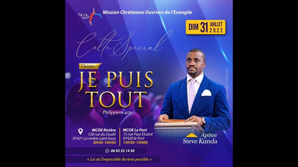 Dans cette vidéo, l’Apôtre Steve KUNDA vous invite au prochain culte de la MCOE, qui aura lieu ce dimanche 14 Août 2022, et qui sera marqué par une grande célébration d’action de grâce pour les 2 ans de la MCOE sur notre belle île de la Réunion 🇷🇪