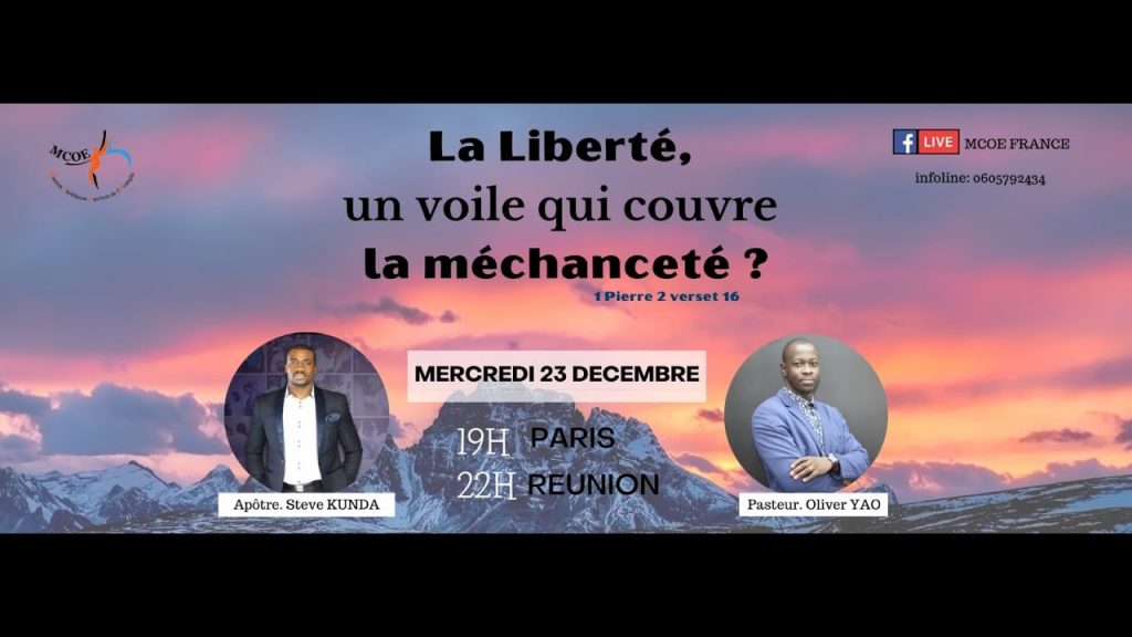 Pour ce direct live spécial Métropole/Île de la Réunion, l’apôtre Steve Kunda et le pasteur Olivier Yao partagent la Parole de Dieu autour du thème « La liberté, un voile qui couvre la méchanceté ? », selon qu’il est écrit dans 1 Pierre 2.16 : « Tant libres, sans faire de la liberté un voile qui couvre la méchanceté, mais agissant comme des serviteurs de Dieu. »