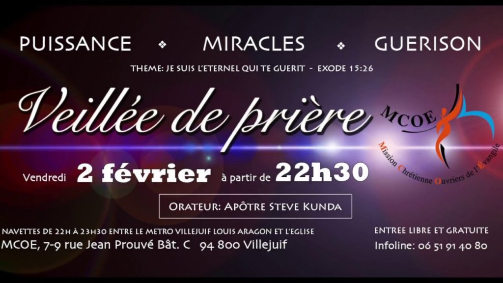 Retrouvez-nous le vendredi 2 février 2018 à partir de 22h30 à la Mission Chrétienne Ouvriers de l’Evangile (MCOE), au 7-9 rue Jean Prouvé à Villejuif. Plus d’infos : 06-51-91-40-80